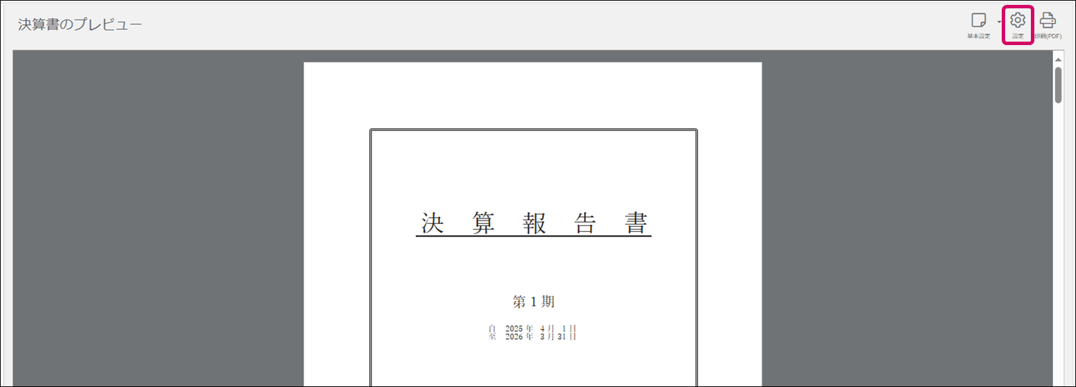 [決算書のプレビュー]画面で画面右上[設定]で印刷設定を行った後に、印刷(PDF)]をクリックし、印刷を行います。
