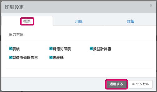 [帳票]タブの[出力対象]で印刷したい諸表にチェックを入れます。