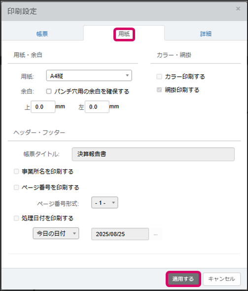 [用紙]タブで余白の調整と[ヘッダー・フッター]情報を編集します。