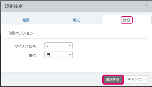 [詳細]タブの[印刷オプション]でマイナス記号と単位を選択します。