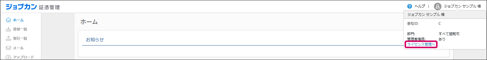 画面右上のお名前をクリックし、表示されたメニューから [ライセンス管理へ] を選択すると、[ライセンスの一覧]画面が表示されるので、その画面でご利用プランをご確認いただけます。