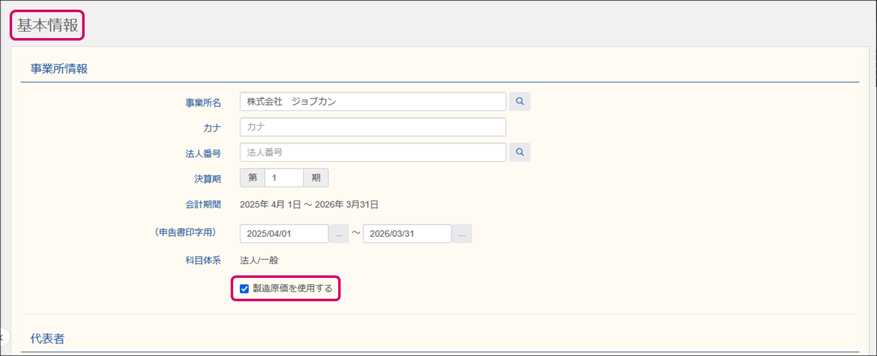基本情報で「製造原価を使用する」にチェックを入れます。