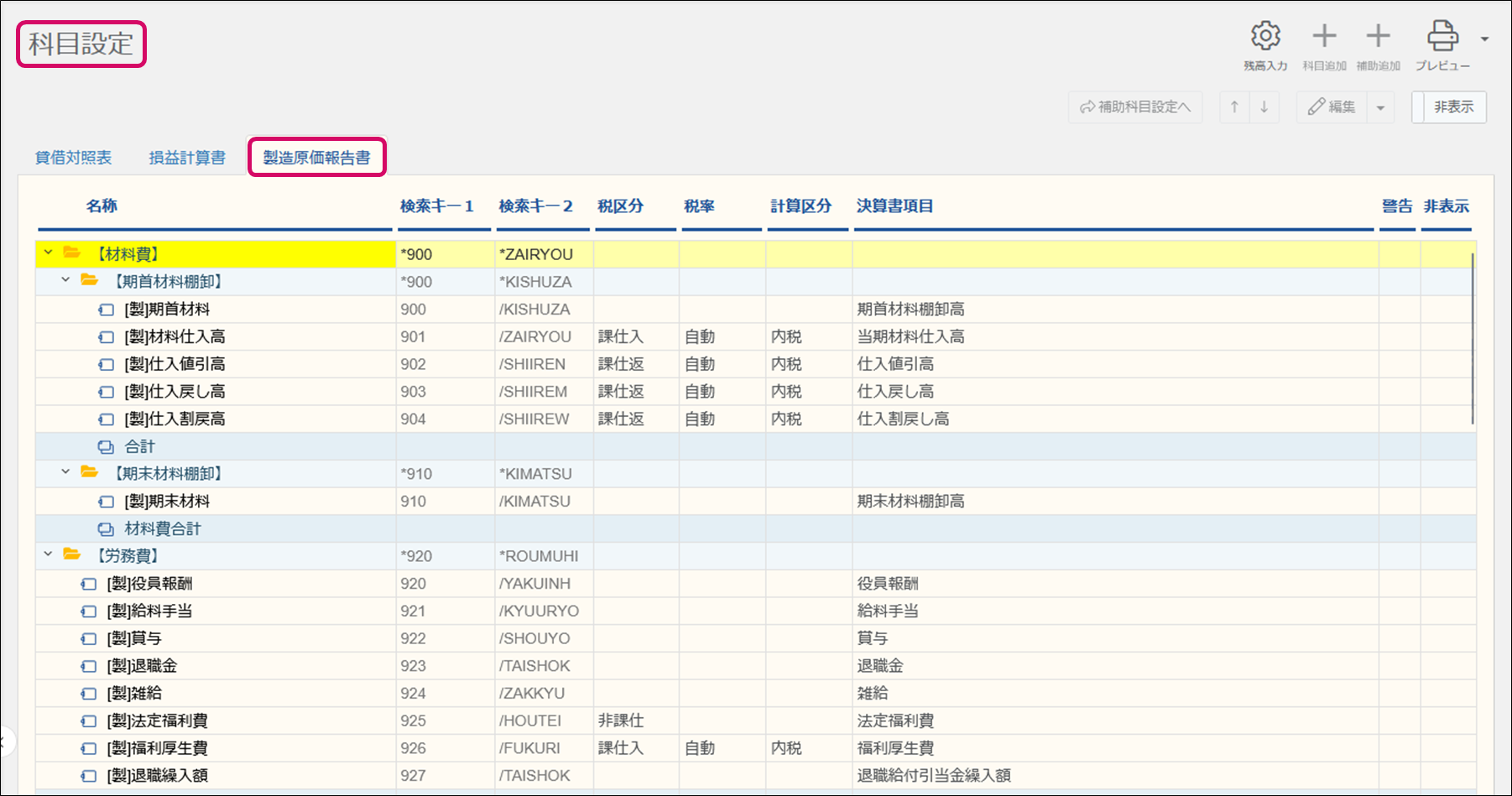 科目設定画面に[製造原価報告書]のタブが追加されます。製造原価の勘定科目には[制]の文字が先頭に表示されています。