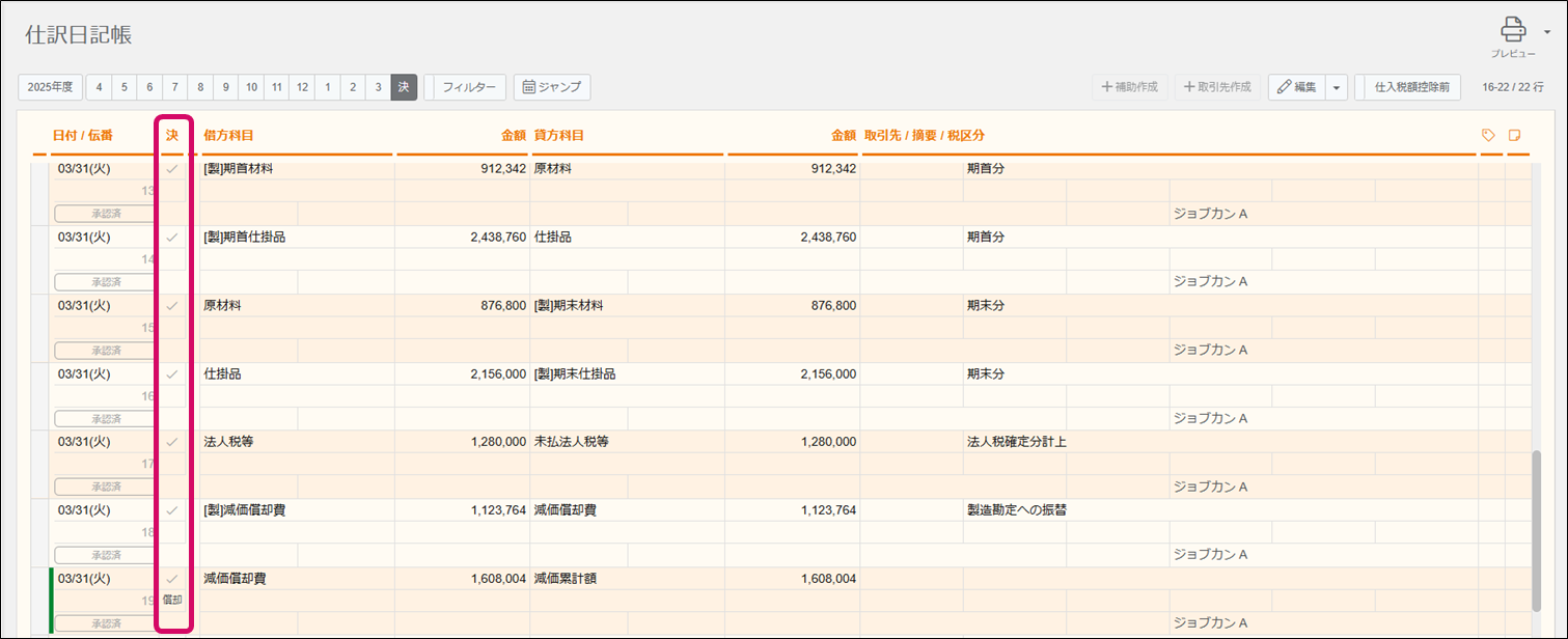 各帳簿画面から、決算仕訳としたい取引行をダブルクリックし、[決]のチェックボックスにチェックを入れます。(仕訳の日付が基本情報で設定した会計期間の末日になります。)