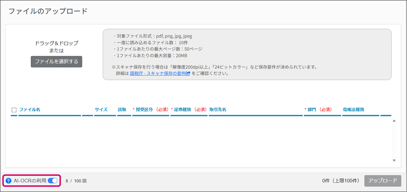 ・ 保存要件・制限の遵守 アップロードするデータが、本ページに記載のファイル要件・スキャナ保存要件を満たしていることを、お客様ご自身の責任においてご確認ください。