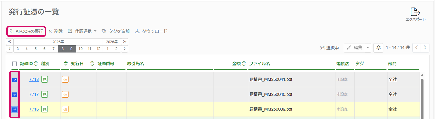 ・ 証憑の一覧画面で複数選択し「AI-OCRの実行」を行います。