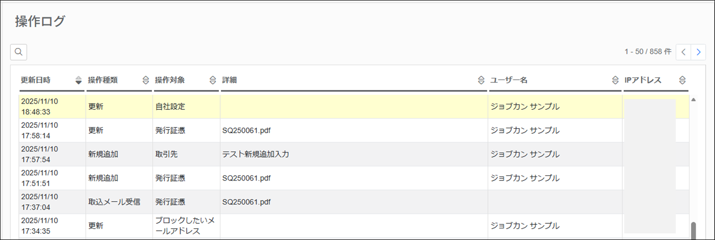 操作ログでは、管理者のユーザーは、自動的に記録・保存された「誰が・いつ・どのような操作(ログイン、登録、削除など)を行ったか」という履歴を確認することができます。