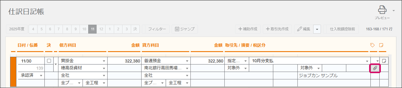 ジョブカン証憑管理で「本登録」した証憑データは、「ジョブカン会計」の仕訳データに添付し、簡単に紐付けることができます。