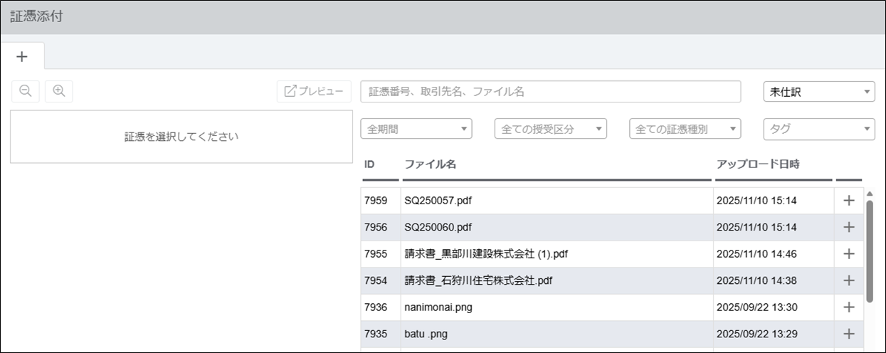 ・ 証憑管理に保存されているデータの一覧が表示されるので、該当の証憑を選択して添付します。
